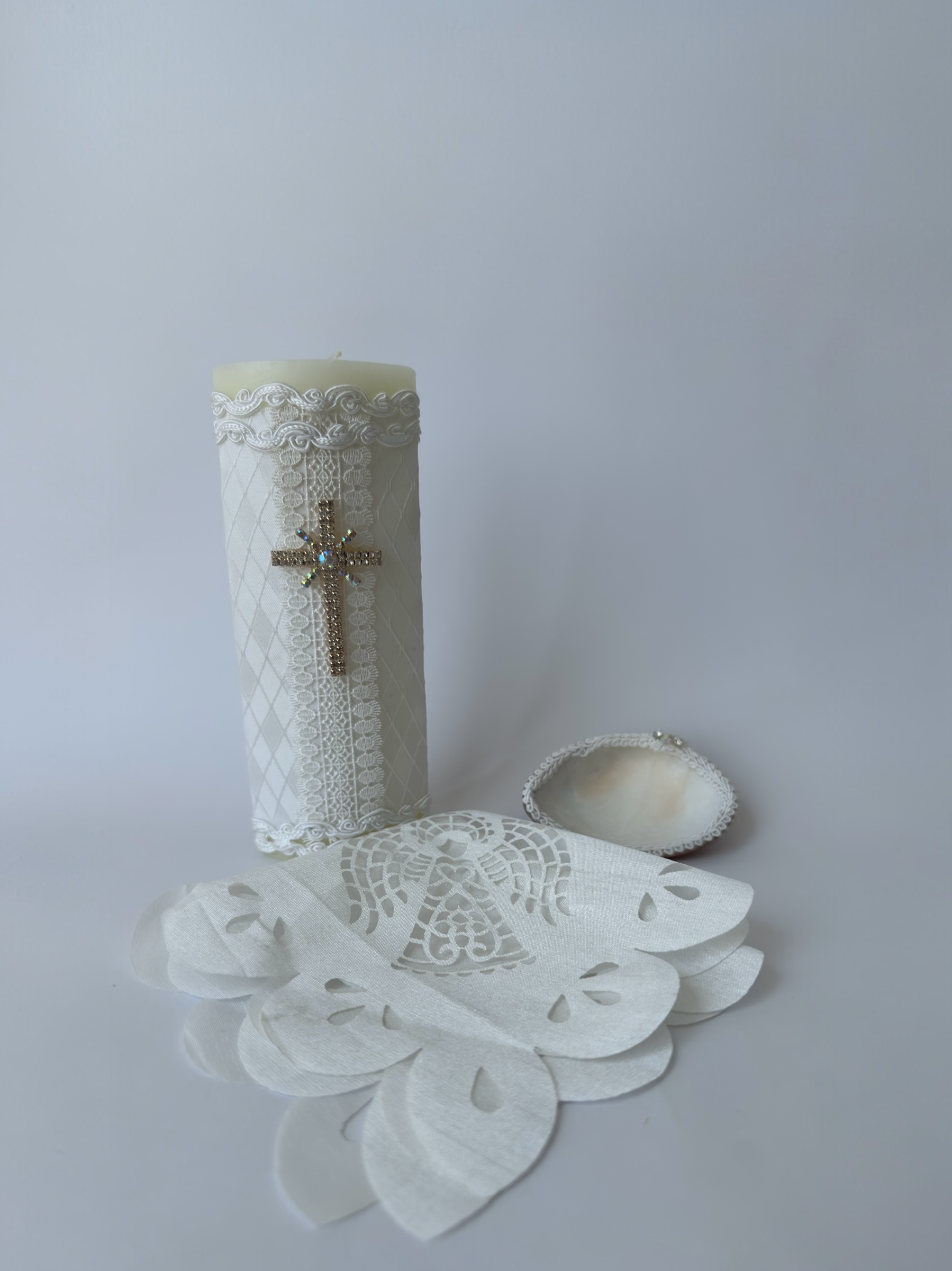 Vela de cirio de parafina ovalada con revestimiento de tela y listón.