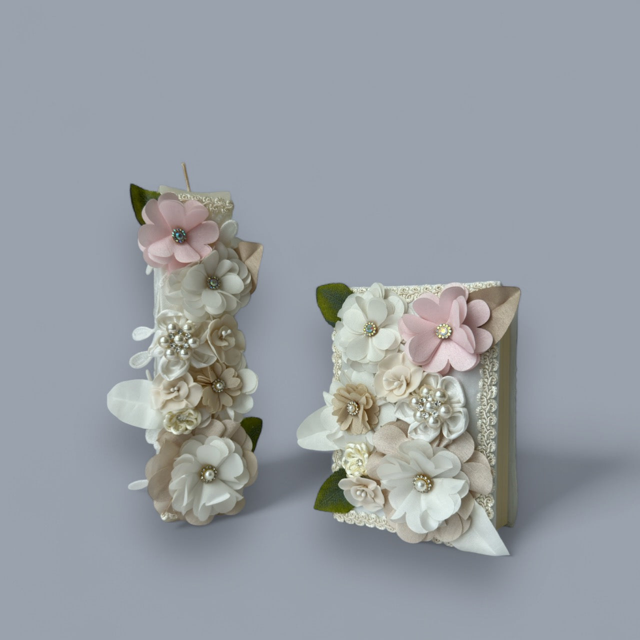 Kit de vela, Biblia, rosario, tocado y velo para primera comunión.