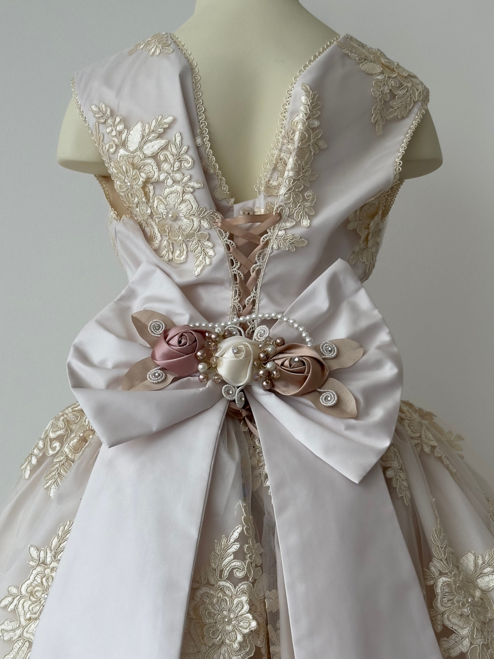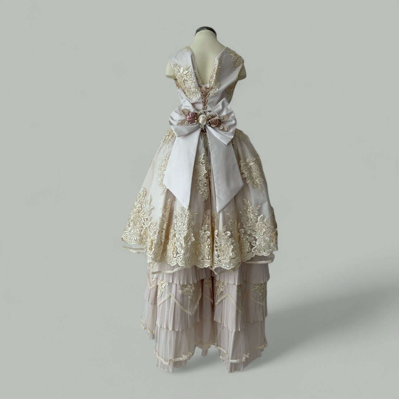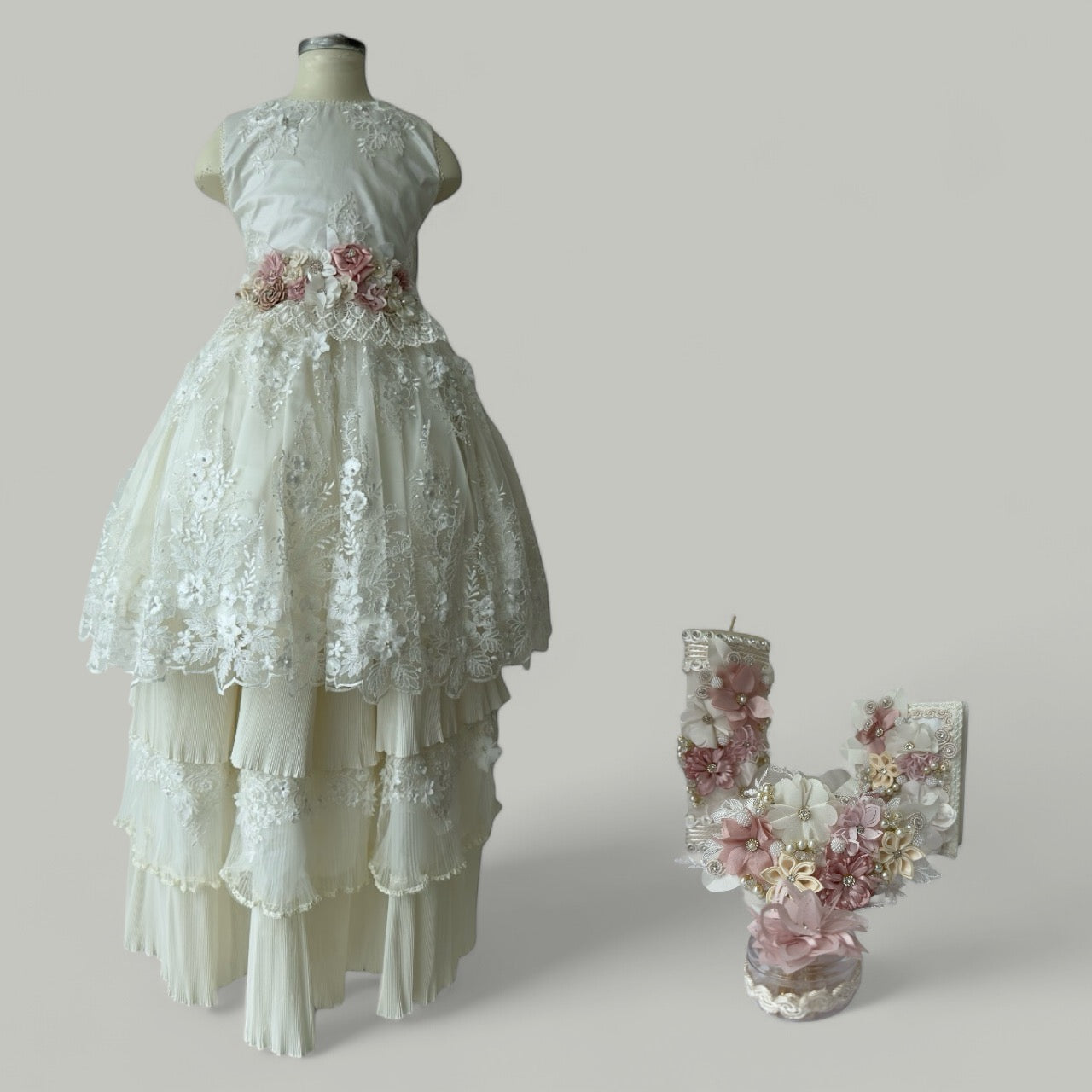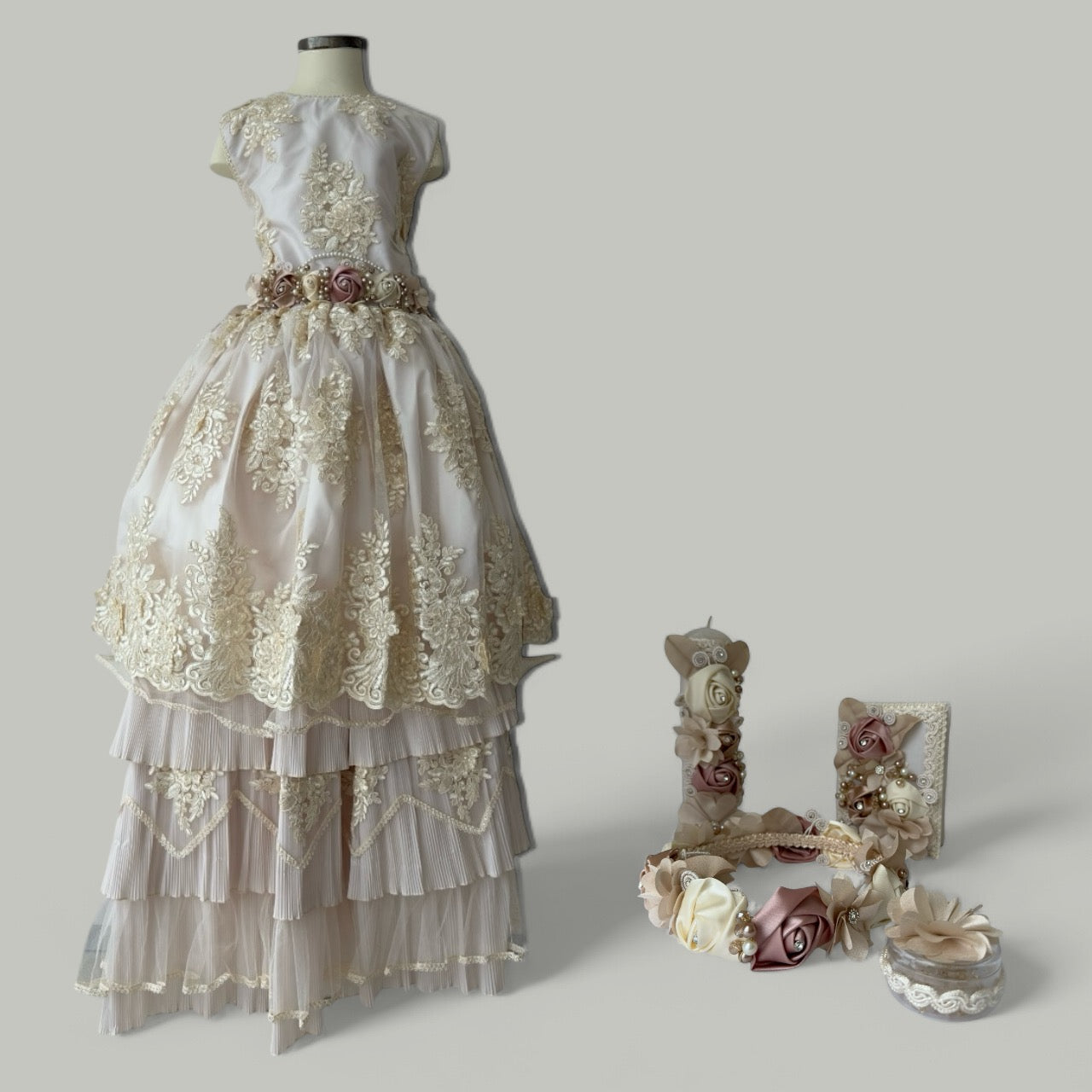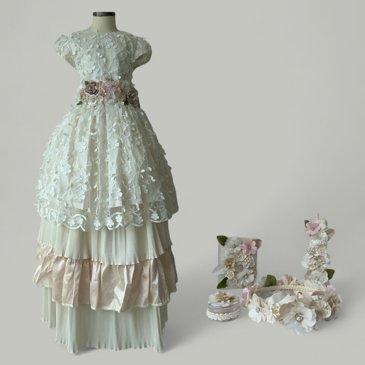 Incluye vestido de primera comunión desmontable, ajuar (vela, Biblia, rosario, tocado y velo)