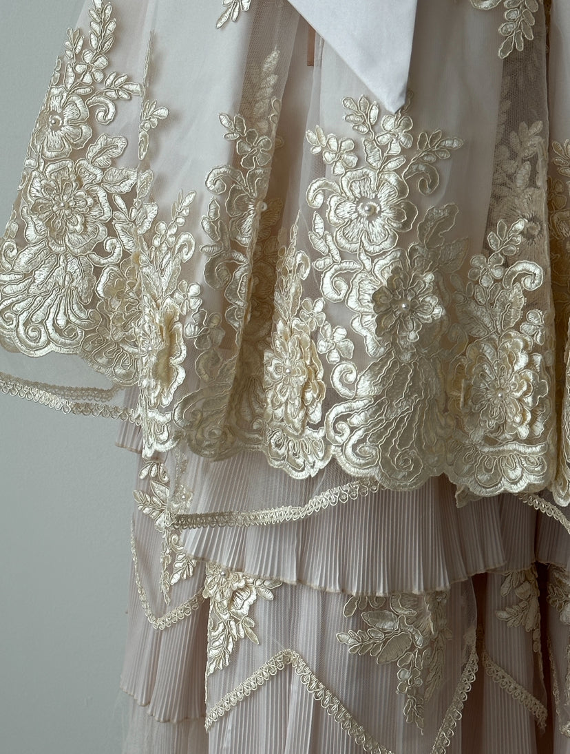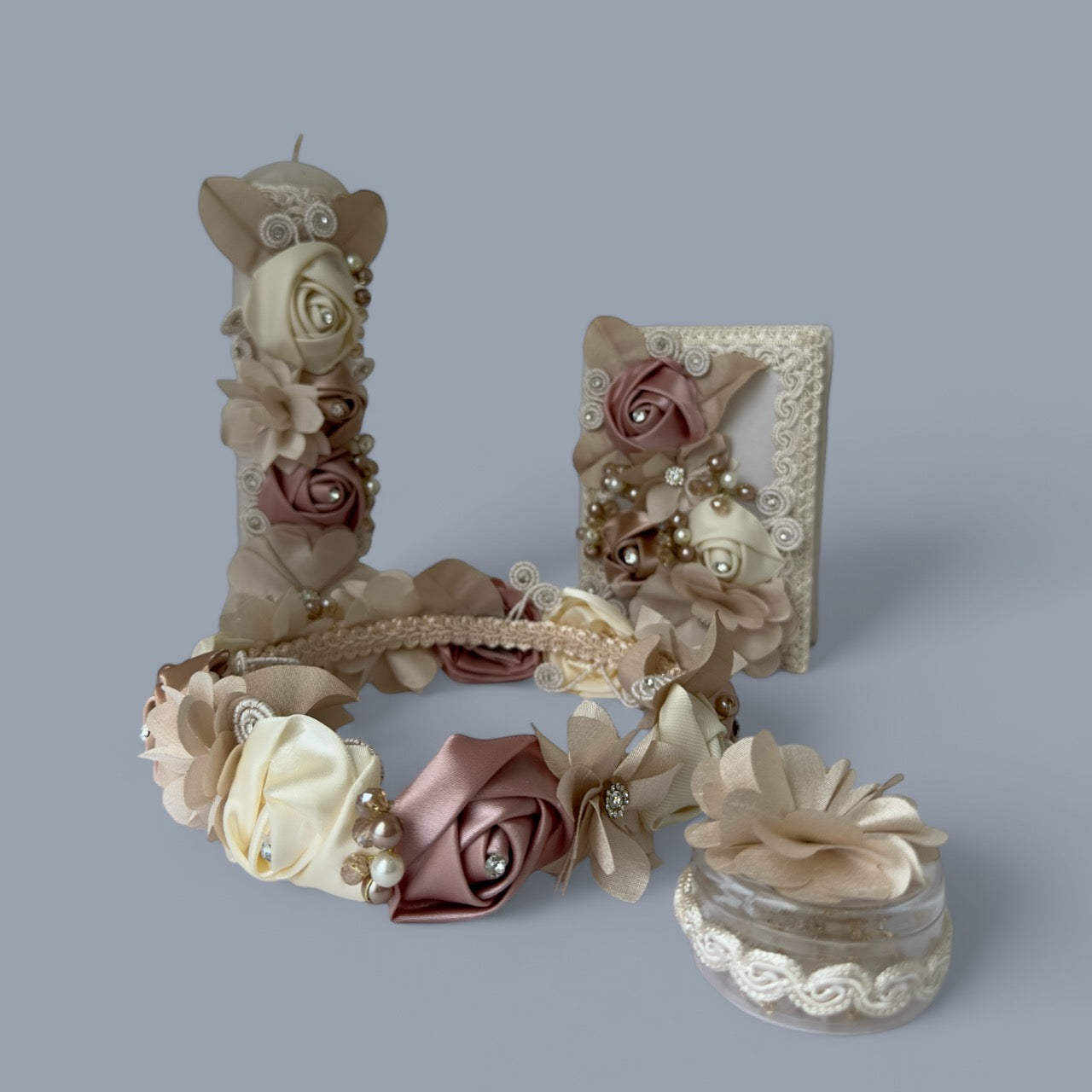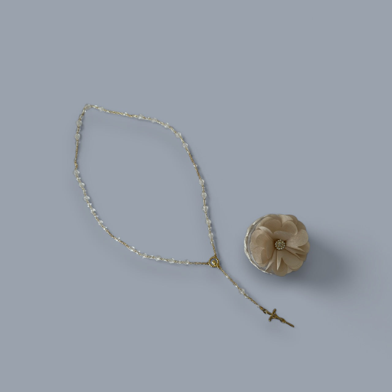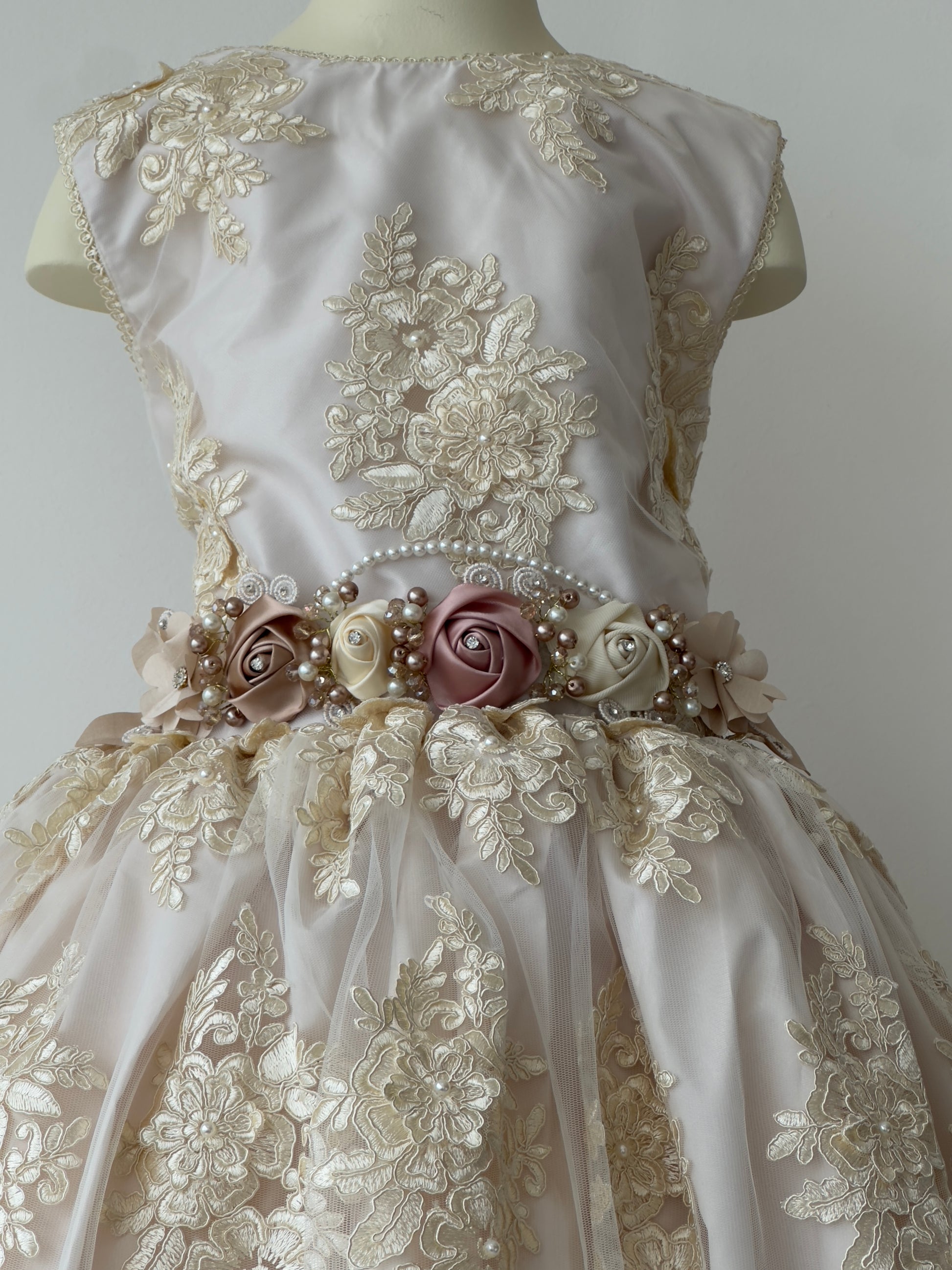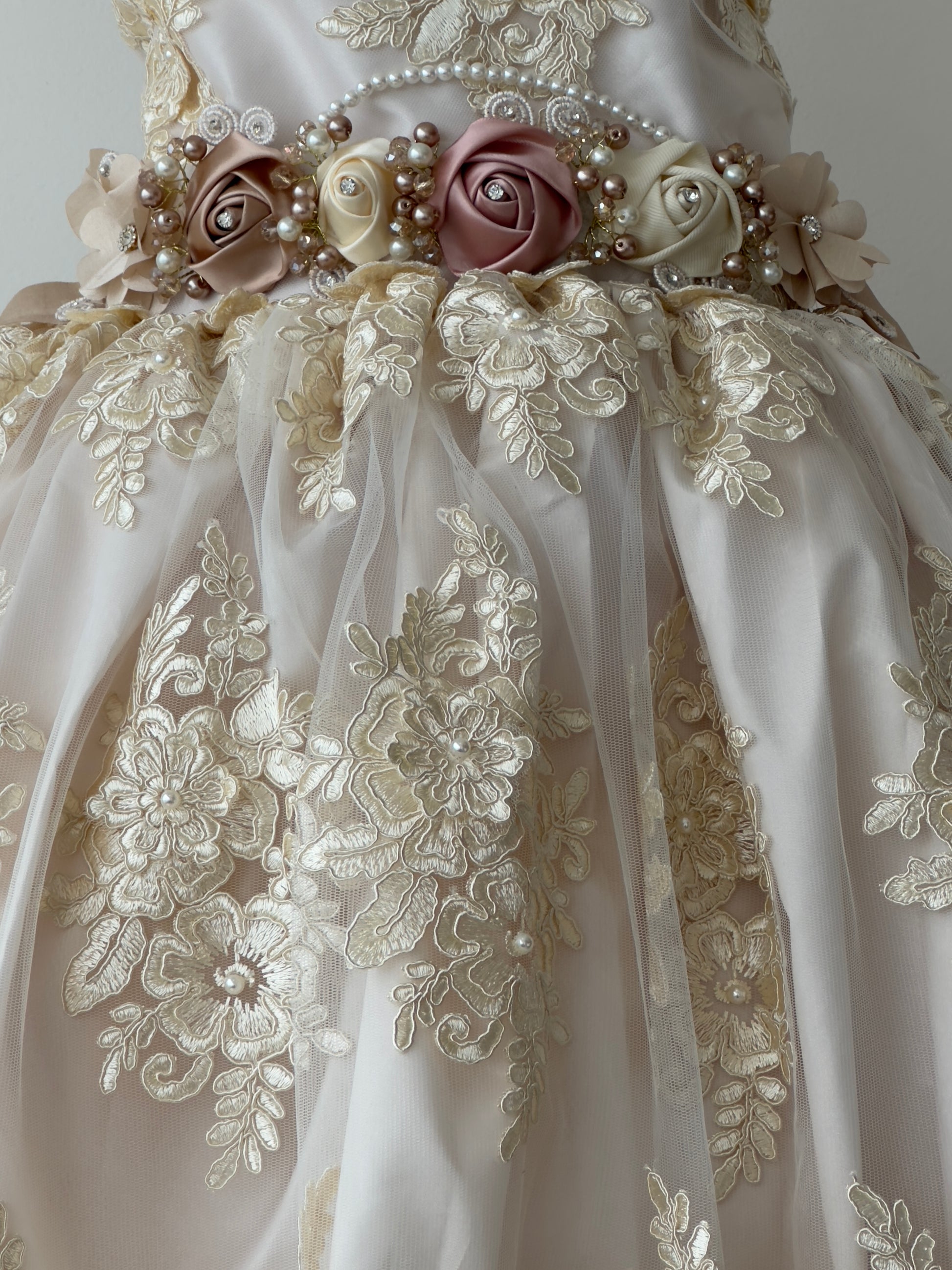 Incluye vestido de primera comunión desmontable, ajuar (vela, Biblia, rosario, tocado y velo)