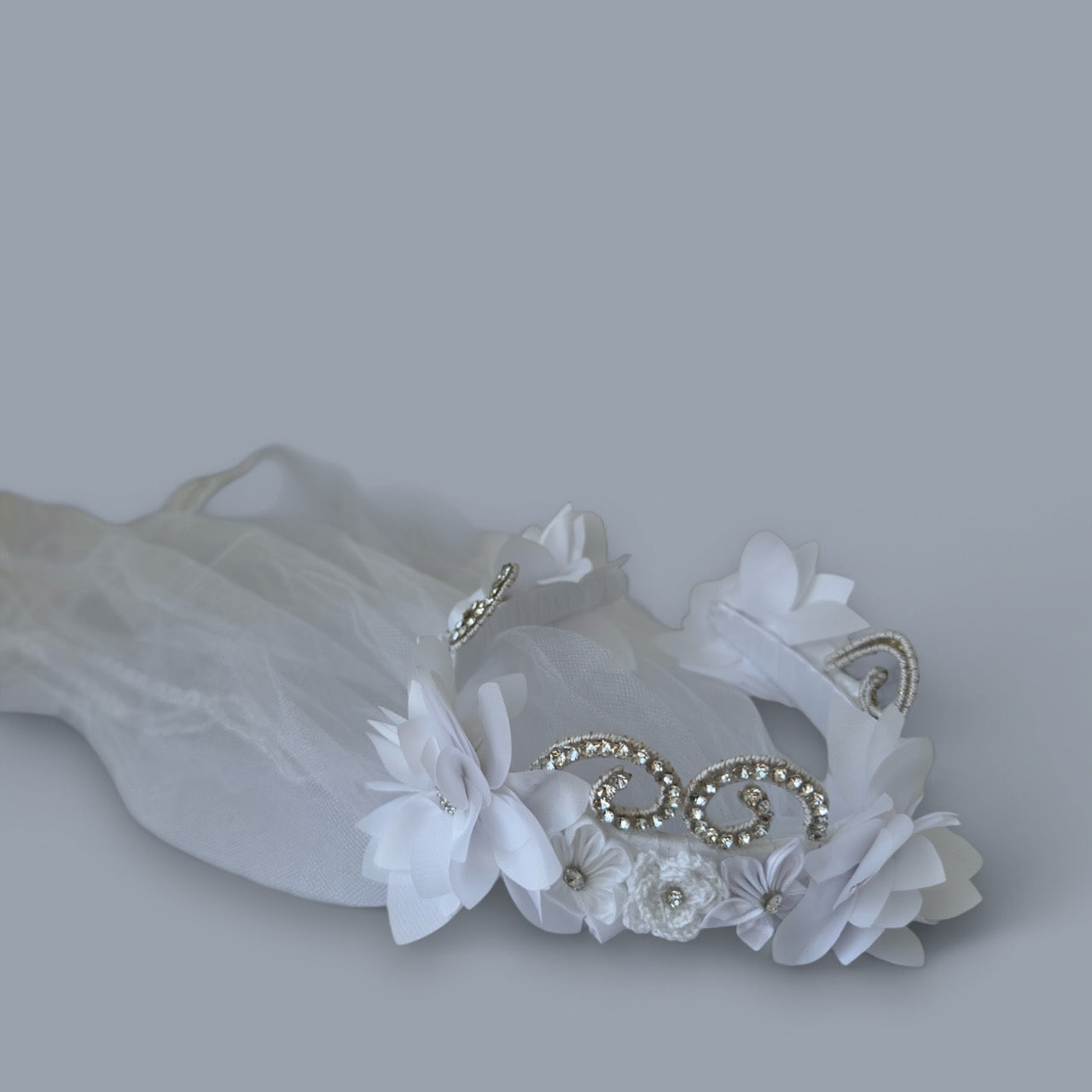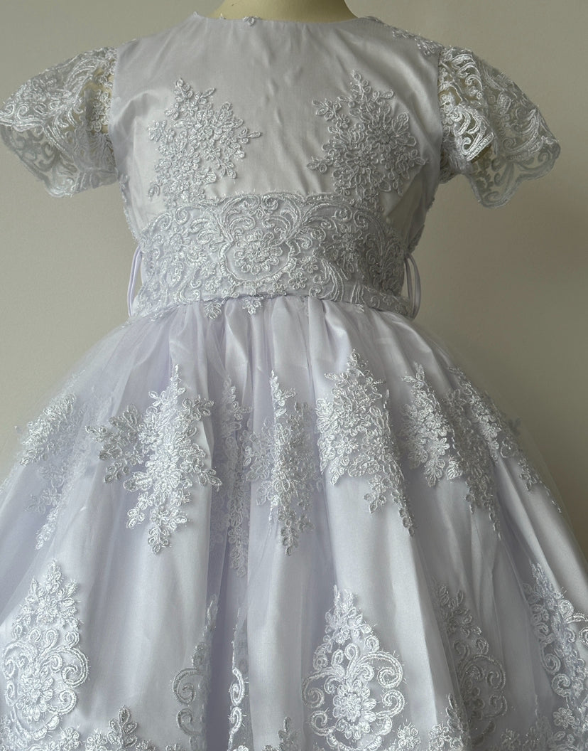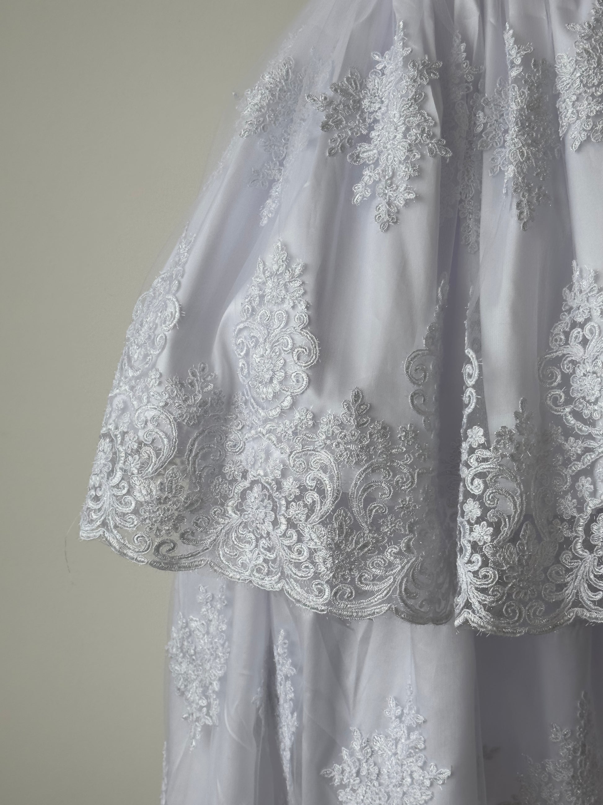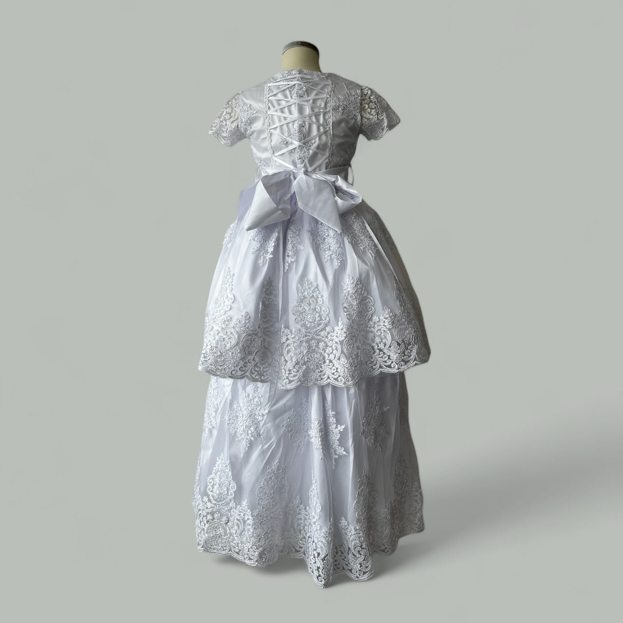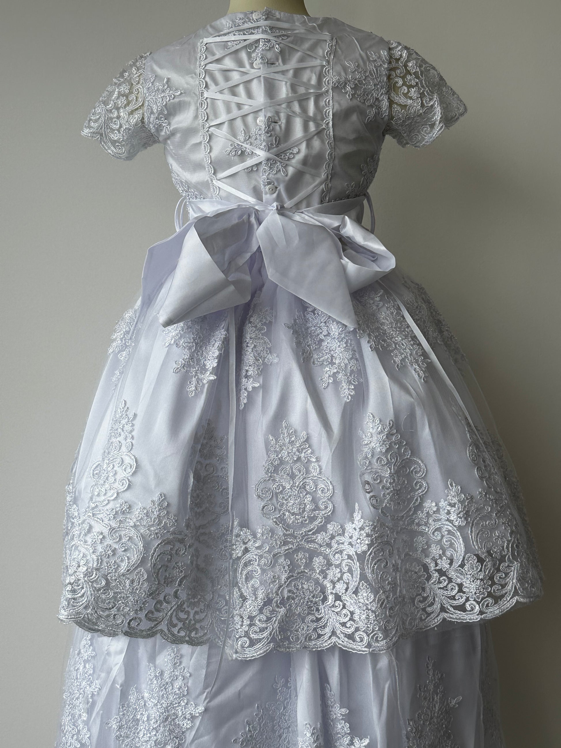 Incluye vestido de primera comunión desmontable, ajuar (vela, Biblia, rosario, tocado y velo)